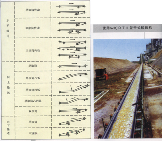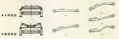TD75型輸送機有五種基本布置型式,即如圖(1)水平、(2)傾斜、(3)凸弧度、(4)凹弧度、(5)凹凸弧度等,機型又分為平帶斷面型、槽帶斷面型兩種。布置形式